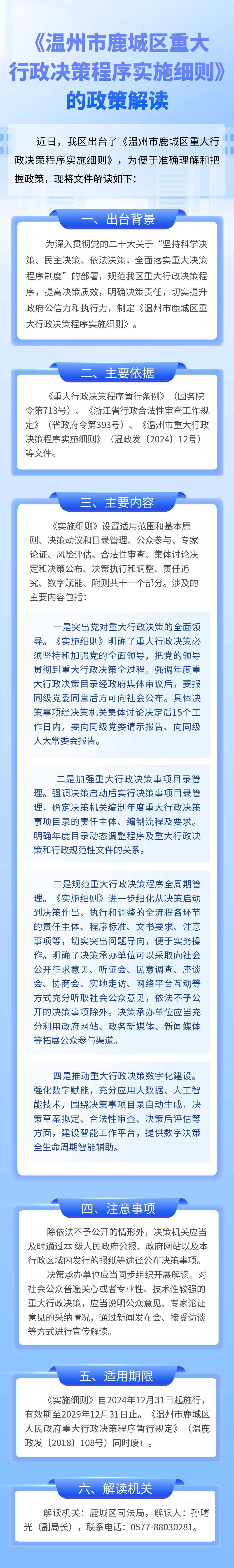 近日,我区出台了《温州市鹿城区重大行政决策程序实施细则》,为便于准确理解和把握政策,现将文件解读如下: 一、出台背景 为深入贯彻党的二十大关于“坚持科学决策、民主决策、依法决策,全面落实重大决策程序制度”的部署,规范我区重大行政决策程序,提高决策质效,明确决策责任,切实提升政府公信力和执行力,制定《温州市鹿城区重大行政决策程序实施细则》。 二、主要依据 《重大行政决策程序暂行条例》(国务院令第713号)、《浙江省行政合法性审查工作规定》(省政府令第393号)、《温州市重大行政决策程序实施细则》(温政发〔2024〕12号)等文件。 三、主要内容 《实施细则》设置适用范围和基本原则、决策动议和目录管理、公众参与、专家论证、风险评估、合法性审查、集体讨论决定和决策公布、决策执行和调整、责任追究、数字赋能、附则共十一个部分。涉及的主要内容包括: 一是突出党对重大行政决策的全面领导。《实施细则》明确了重大行政决策必须坚持和加强党的全面领导,把党的领导贯彻到重大行政决策全过程。强调年度重大行政决策目录经政府集体审议后,要报同级党委同意后方可向社会公布。具体决策事项经决策机关集体讨论决定后15个工作日内,要向同级党委请示报告、向同级人大常委会报告。 二是加强重大行政决策事项目录管理。强调决策启动后实行决策事项目录管理,确定决策机关编制年度重大行政决策事项目录的责任主体、编制流程及要求。明确年度目录动态调整程序及重大行政决策和行政规范性文件的关系。 三是规范重大行政决策程序全周期管理。《实施细则》进一步细化从决策启动到决策作出、执行和调整的全流程各环节的责任主体、程序标准、文书要求、注意事项等,切实突出问题导向,便于实务操作。明确了决策承办单位可以采取向社会公开征求意见、听证会、民意调查、座谈会、协商会、实地走访、网络平台互动等方式充分听取社会公众意见,依法不予公开的决策事项除外。决策承办单位应当充分利用政府网站、政务新媒体、新闻媒体等拓展公众参与渠道。 四是推动重大行政决策数字化建设。强化数字赋能,充分应用大数据、人工智能技术,围绕决策事项目录自动生成,决策草案拟定、合法性审查、决策后评估等方面,建设智能工作平台,提供数字决策全生命周期智能辅助。 四、注意事项 除依法不予公开的情形外,决策机关应当及时通过本 级人民政府公报、政府网站以及本行政区域内发行的报纸等途径公布决策事项。 决策承办单位应当同步组织开展解读。对社会公众普遍关心或者专业性、技术性较强的重大行政决策,应当说明公众意见、专家论证意见的采纳情况,通过新闻发布会、接受访谈等方式进行宣传解读。 五、适用期限 《实施细则》自2024年12月31日起施行,有效期至2029年12月31日止。《温州市鹿城区人民政府重大行政决策程序暂行规定》(温鹿政发〔2018〕108号)同时废止。 六、解读机关 解读机关:鹿城区司法局,解读人:孙曙光(副局长),联系电话:0577-88030281。 政策原文: